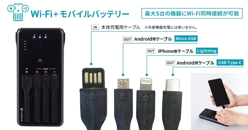 さらに端末自体がモバイルバッテリーの機能も兼ねており、スマホの充電も同時にできる便利さも特徴。端末にコードもついているため、コンパクトに持ち運べる仕様になっています!