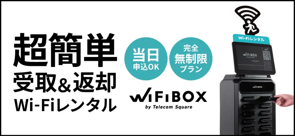 WiFiBOXは、空港や商業施設にある無人ボックスから、非対面でサッと受取・返却できる新しいタイプのWiFiレンタルです。